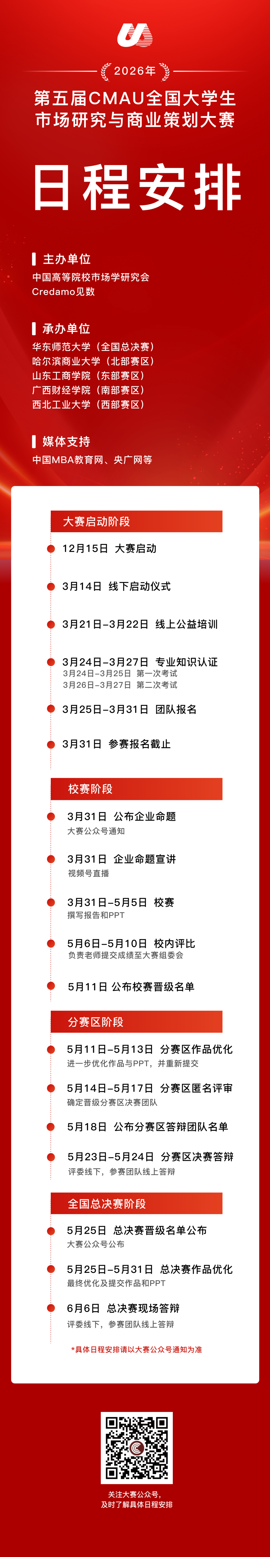 为配合报名截止时间的延长,确保各位参赛师生有更充裕的时间备赛,经大赛组委会研究决定,对后续赛程安排进行相应调整。原定于专业知识认证、团队报名、参赛报名截止,以及校赛阶段涉及的企业命题公布、宣讲直播和校赛周期均将顺延。具体的最新日程安排,请参见下方日程图,请大家相互转告,及时关注。请各参赛选手在微云盘链接中下载【第五届CMAU市策大赛院校沟通群】文件夹,查找自己院校的群二维码并加入沟通群,以及时获取大赛相关资讯。第五届市策大赛将继续沿用往届大赛的沟通群聊,参加过上届大赛的参赛选手可不必重复加群。每位参赛选手只需加入一个沟通群即可,无需重复加群。所有进群的同学请务必修改群备注,格式为:姓名+学号+专业(例:张三+17095125+市场营销),便于老师核对和沟通。微云链接:https://share.weiyun.com/E5u5KMxv(复制链接使用电脑浏览器打开,直接下载后识别二维码加群)加群方式:直接通过学校名称查找对应学校的二维码,如果找不到对应的院校,说明该院校报名选手人数不足10人,为了方便沟通与协调,这些院校的选手将统一加入一个群,群二维码编号为“第五届CMAU市策大赛沟通群”。