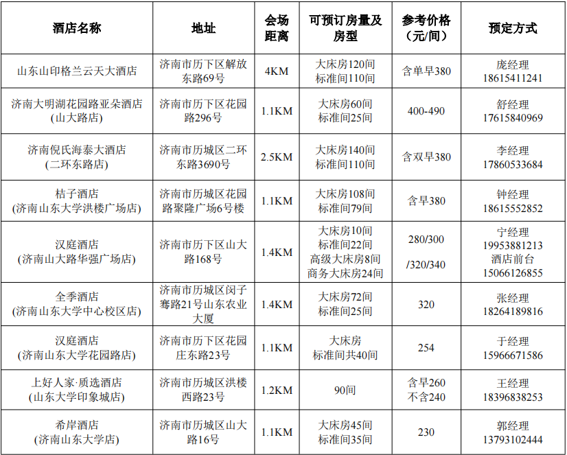 1. 因参会人数众多,请大家尽早预订酒店,以免给您的参会带来不便。