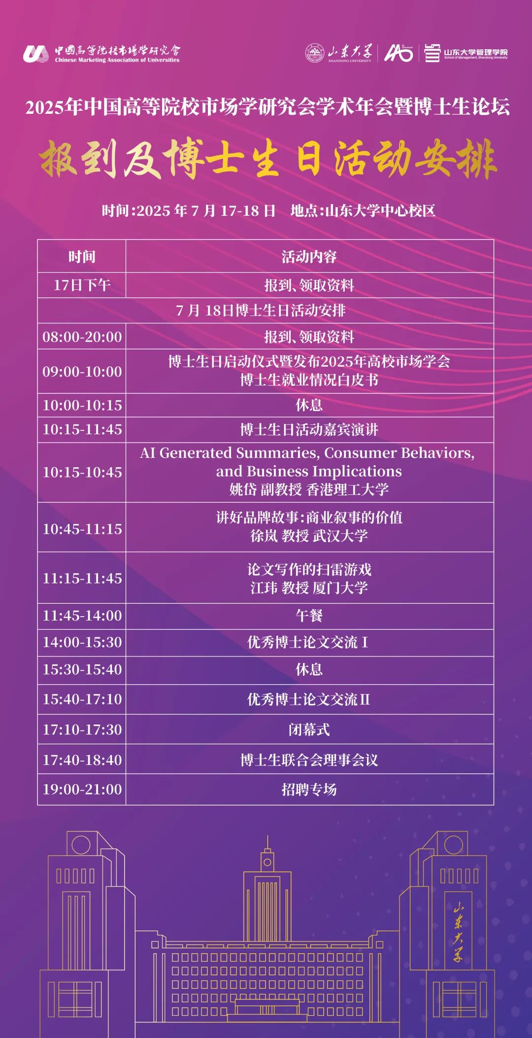 “2025年中国高等院校市场学研究会学术年会暨博士生论坛”将于2025年7月18日至20日在“泉城”——济南召开,由中国高等院校市场学研究会主办、山东大学管理学院承办。本次会议的主题为“大模型与营销创新”,届时将邀请营销学界的知名学者与会,一起交流探讨大模型与营销创新的新趋势,分享营销研究在大模型背景下的现实挑战和解决相关营销实践问题。